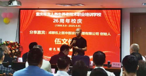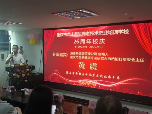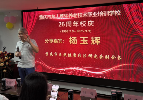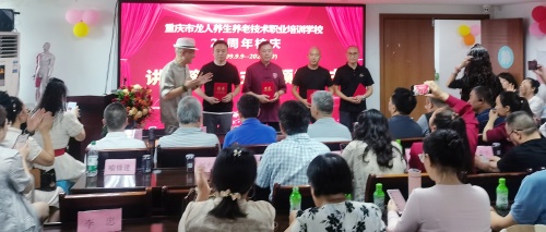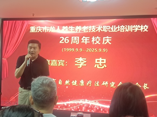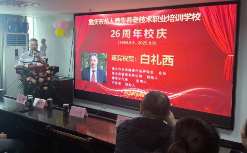重庆市自然健康疗法研究会白礼西会长参加校庆活动并致辞,对龙人学校26周年校庆表示热烈祝贺,重庆市龙人养生养老技术职业培训学校是重庆市自然健康疗法研究会指定的培训基地,在未来的日子里双方将更加紧密合作。